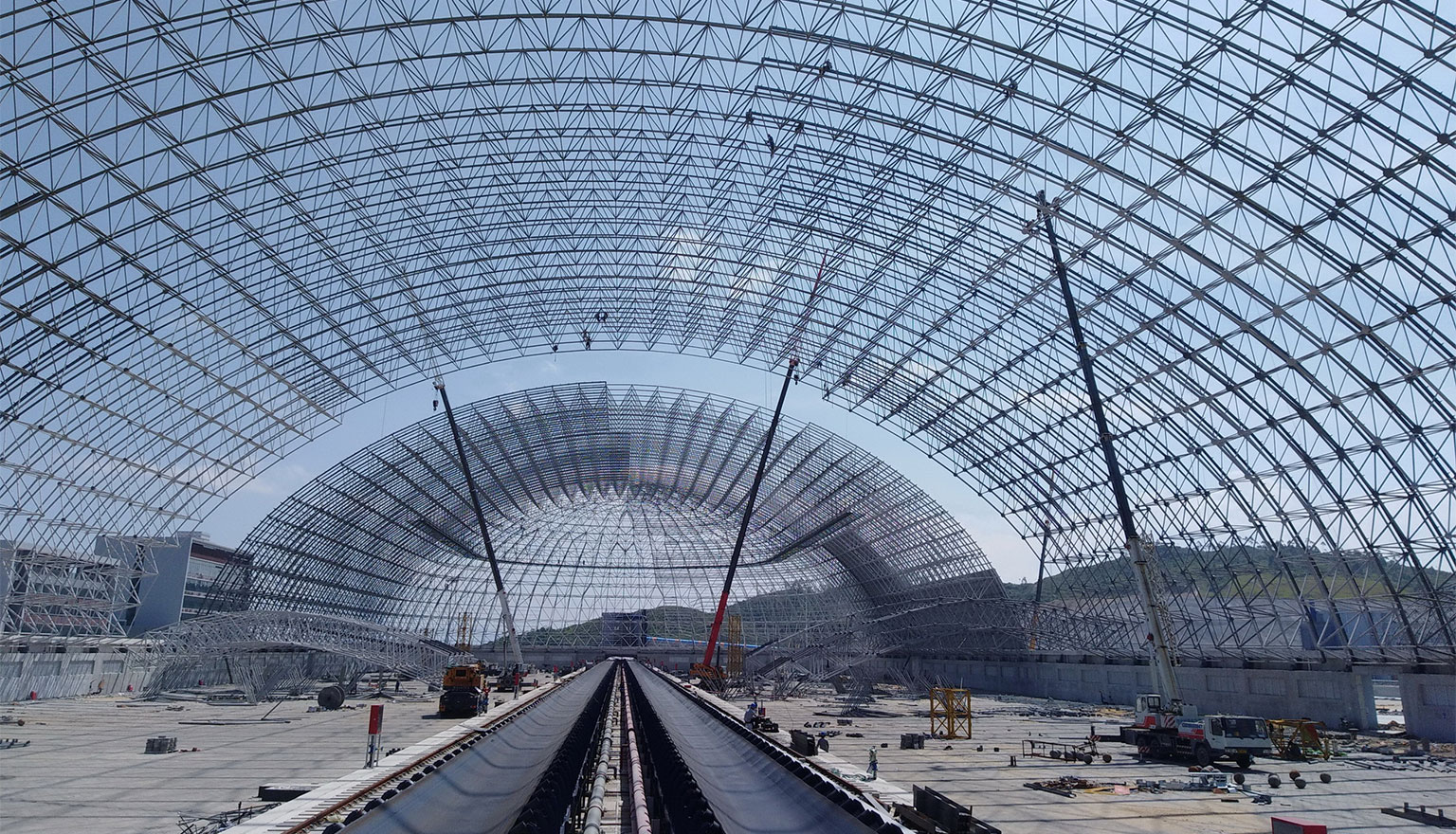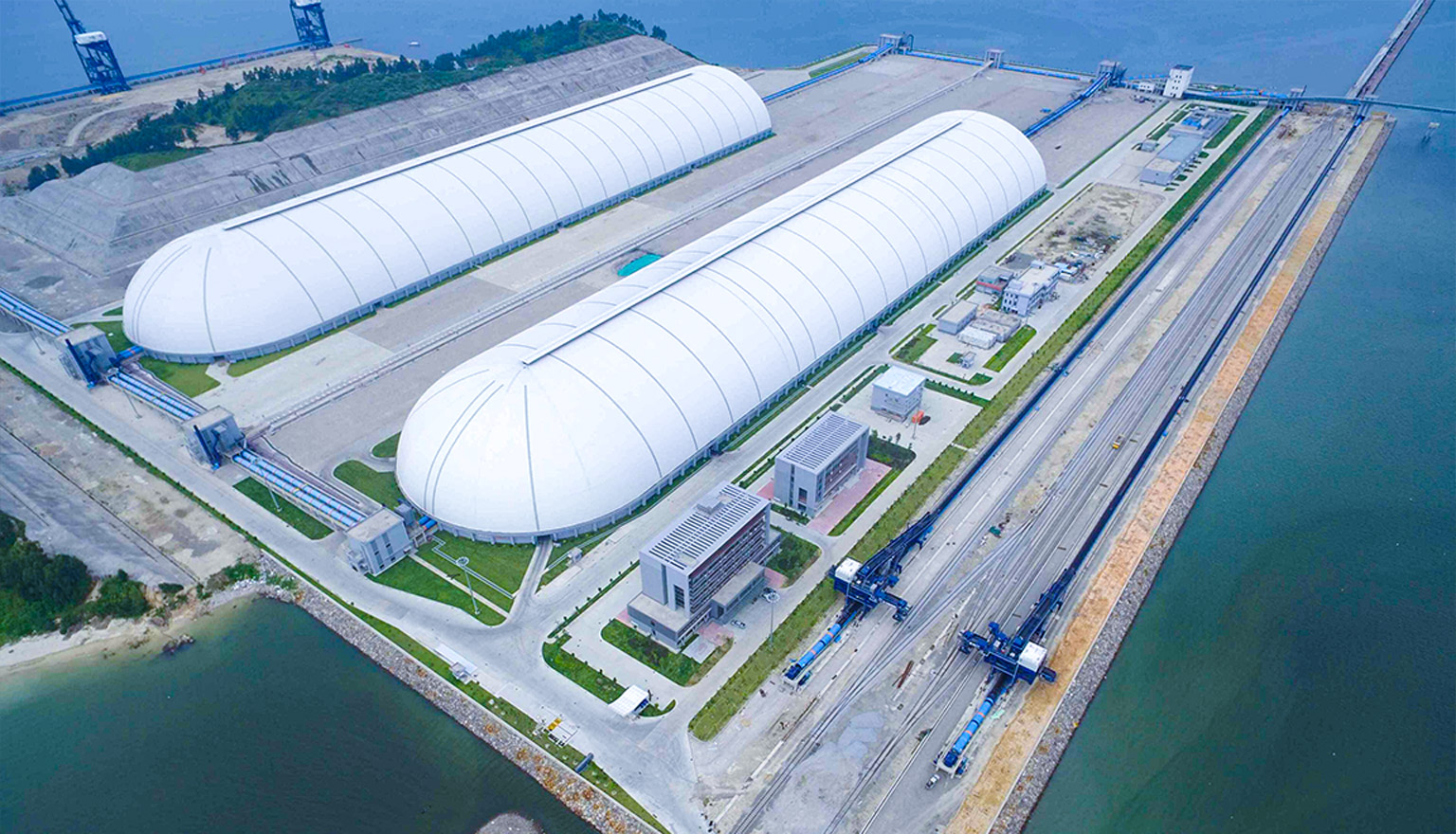項目位于廣東省惠州市荃灣港區,建筑面積11.5萬平方米,總煤容量約為102萬噸,單座煤場平面尺寸為500米x118米,網殼頂標高43.7米,共兩座。本工程采用端部帶1/4球殼的雙層三心圓柱面網殼結構、新型分離式直連真空預壓地基處理技術、先進的抗臺風設計、可拆卸結構等先進技術。榮獲中國建筑學會優秀工業建筑設計一等獎、中國鋼結構金獎。