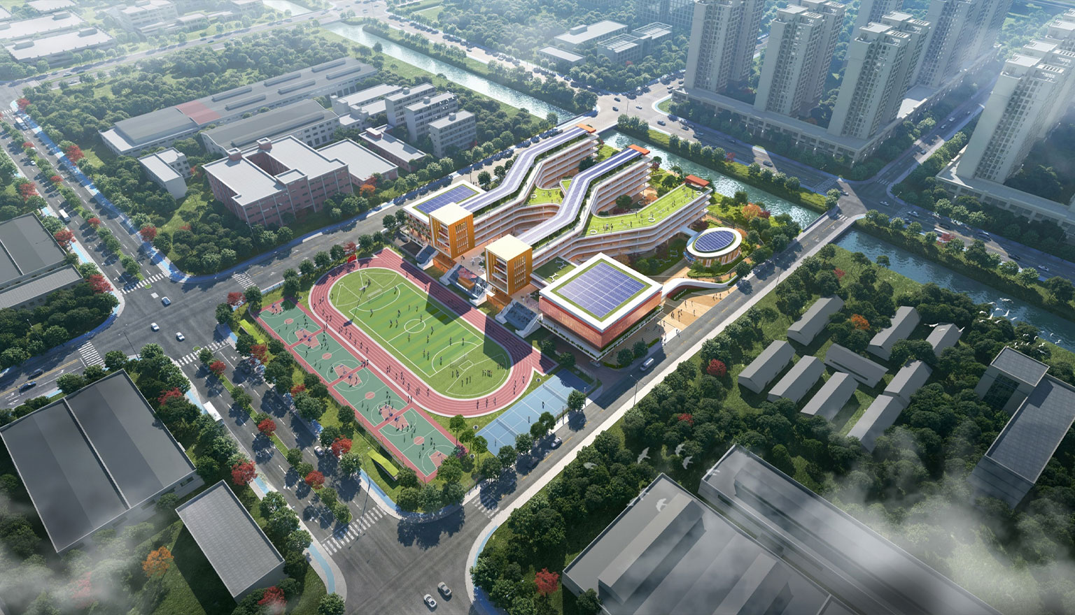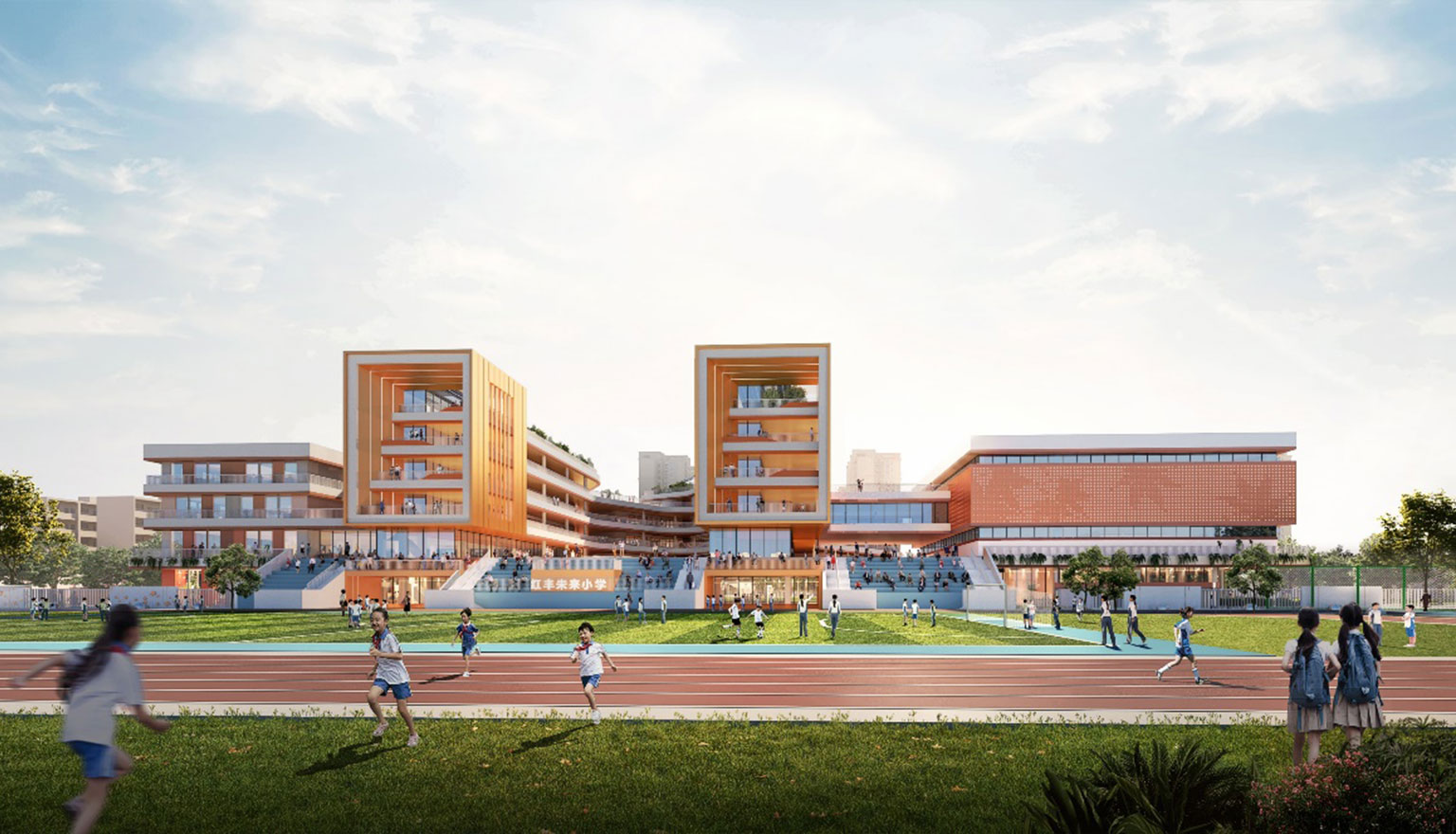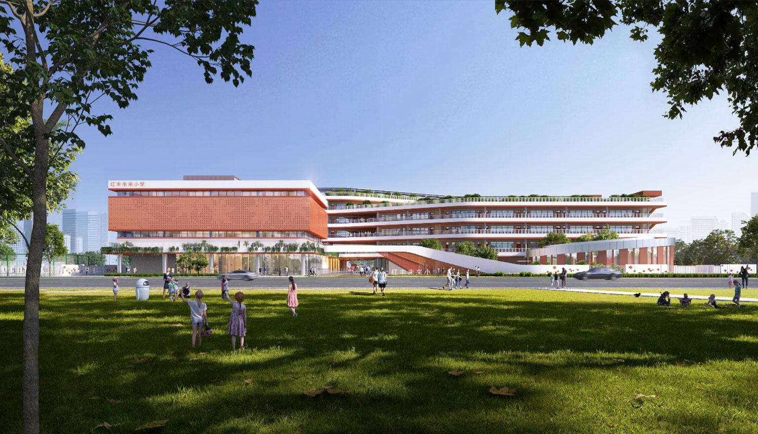 項目位于杭州市余杭區紅豐創新帶的核心位置,總用地面積31033 平方米,總建筑面積30410 平方米。項目為36班小學,以“紅楓”為主題元素,力求打造一個花園式、體現地域型的超低能耗綠色校園。