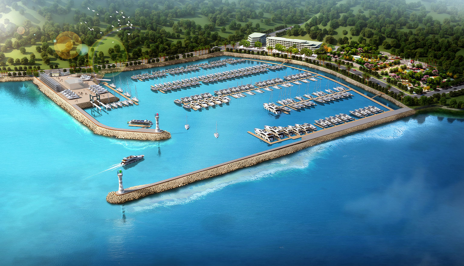建設(shè)俱樂部大樓、約700米長的防波堤,8350平方米的游艇存放平臺,234個帆船及游艇泊位,124個干船艙,單線斜坡道和跨運車碼頭等設(shè)施。